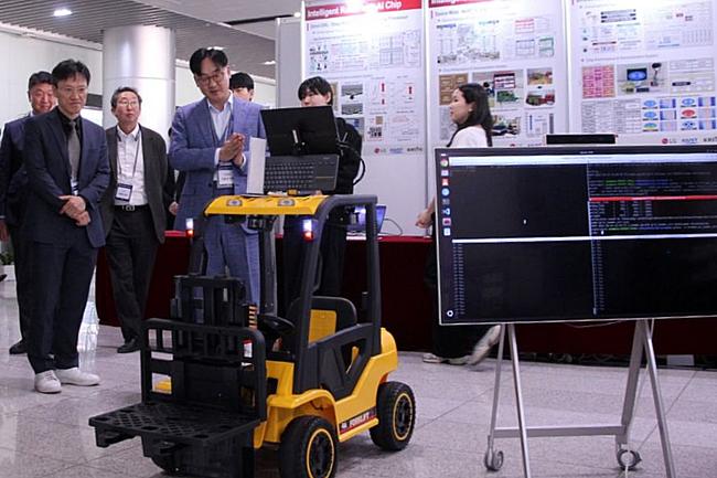 24일 진행한 `Future 2030 서밋`에서 LG전자의 P5G 통신 기술을 활용해 스마트팩토리에서 활용하는 무인 지게차 로봇 제어 시연을 진행하고 있다. 행사장에서는 LG전자의 ▲6G 전이동통신(FDR·Full Duplex Radio) 솔루션 ▲P5G 통신 기반 스마트팩토리 무인 지게차 로봇 제어 ▲비지상통신망(NTN)을 활용한 차세대 음성통신 솔루션 등이 시연돼 큰 관심을 끌었다. KAIST와 KRISS는 AI 반도체 기반 로봇, 6G 전파 측정 시스템, 양자 컴퓨팅 소재 SW 솔루션 등 다양한 연구성과를 전시했다.
