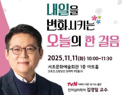 11일 오전 10시에는 서초문화예술회관 아트홀에서 명사 특강이 열린다. 인지심리학자 김경일 교수가 `내일을 바꾸는 오늘의 한걸음`이라는 주제로 인생 후반기의 행복은 멀리 있는 미래가 아니라 오늘 내딛는 작은 한걸음에서 시작된다는 의미를 전한다. 퇴직과 경력 단절로 힘들어하는 50+세대에게 멈추지 않고 다시 시작할 수 있는 용기를 북돋울 예정이다.